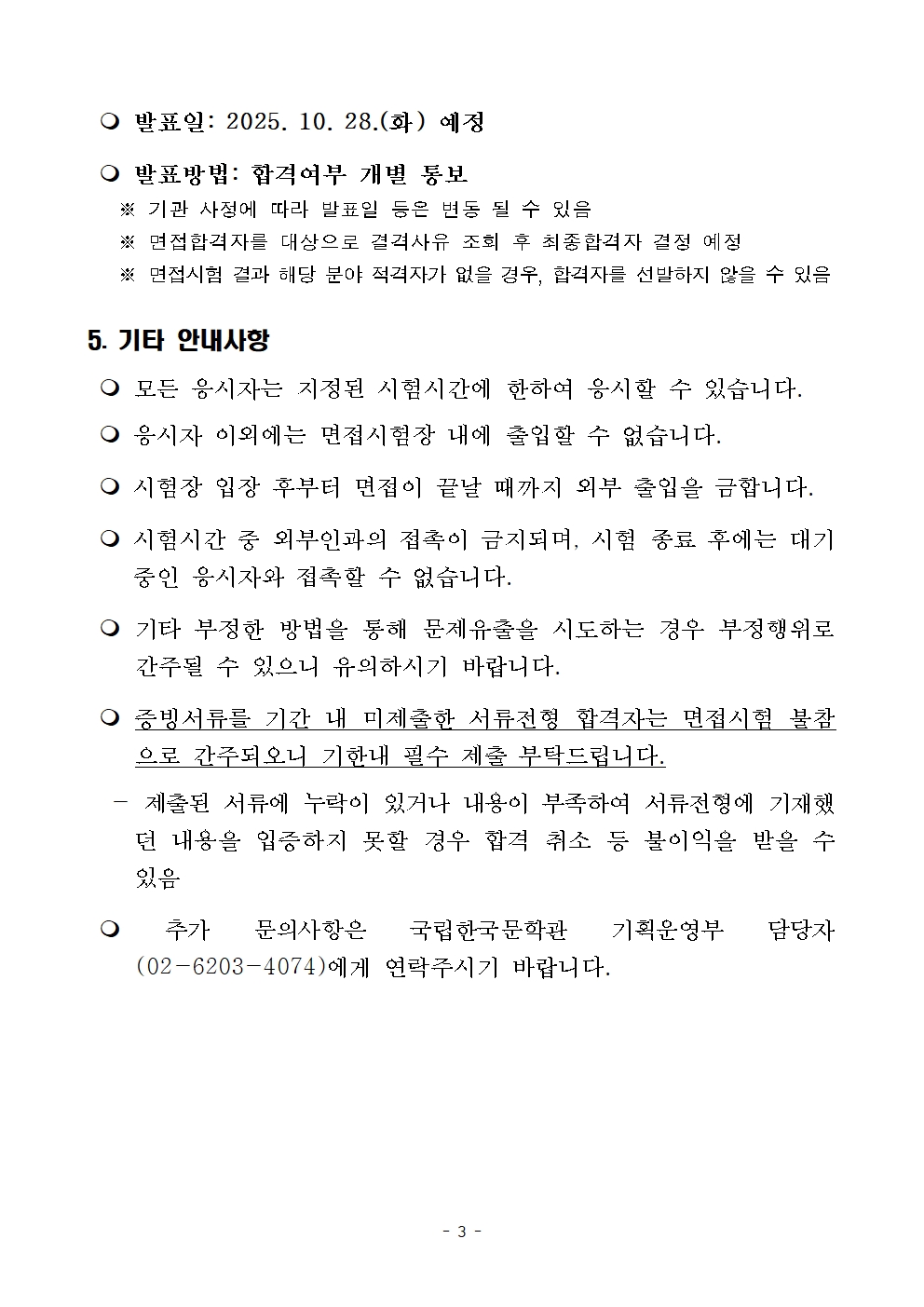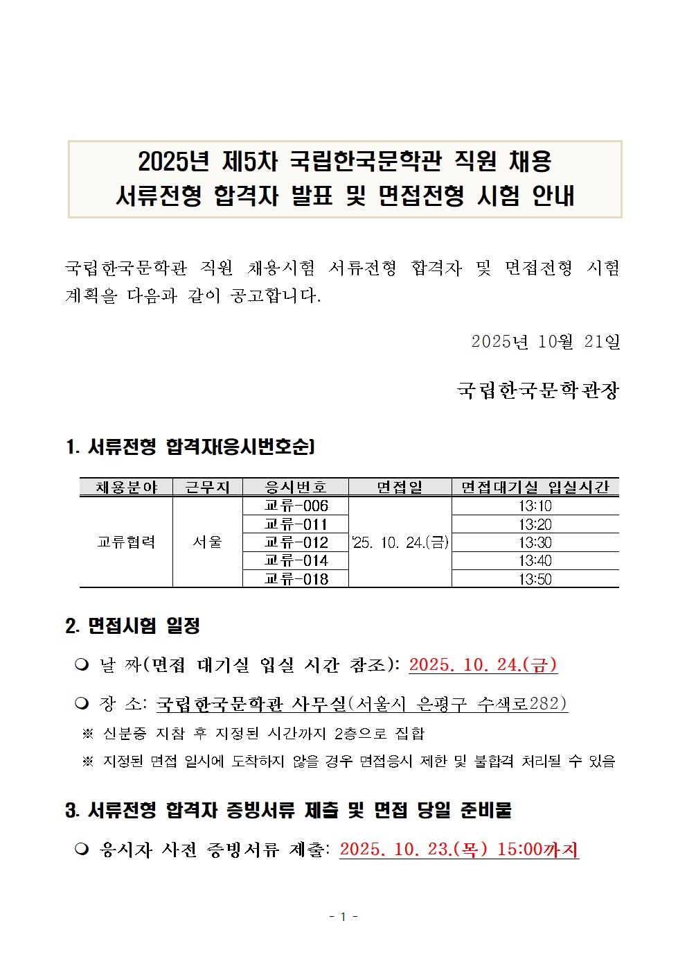 2025년 제5차 국립한국문학관 직원(휴직 대체) 채용 서류전형 합격자 발표 및 면접시험 안내